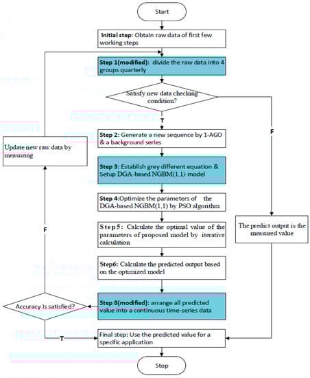 Grey system theory is seen as an important approach for processing small sized sample discrete sets []. Its main idea is to adequately utilize and develop the limited information of raw data. The weakly dependent stochastic sequences are conducting IAGO on raw data to further seek the change law underlying the grey system. Traditional GM (1,1) can be applied in the stationary sequence of power exponential growth, while it is inapplicable to time series with quarterly fluctuation. Wang et al. [] introduced a data grouping approach into GM (1,1) model to establish a DGA-based GM (1,1) model, it can effectively identify the quarterly fluctuation of linear data series, however, it is unable to forecast the nonlinear tendency of data series. As actual quarterly time series usually contain nonlinear fluctuation features, in order to improve the applicability of GM (1,1) model to nonlinear model, Ma et al. [] introduced the kernel method into the model to build nonlinear grey model and proved the kernel method can effectively deal with complicated nonlinear time series []. The nonlinear grey Bernoulli model exhibits preferable forecasting capability on nonlinear time series data, however, it fails to identify the quarterly fluctuation in time series data. Thus, this research proposes the use of a data grouping approach into NGBM (1,1) model, to further build DGA-based NGBM (1,1). The aim is to identify the quarterly and nonlinear tendency of the time series data for the sales volume of China’s NEVs. The modeling process is described as: