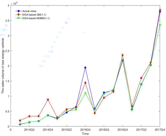 To verify the effectiveness and superiority of DGA-based NGBM (1,1), this research uses the sales volume of China’s NEVs during 2013–2017 as raw data to conduct an empirical analysis: based on raw data, DGA-based GM (1,1) model and DGA-based NGBM (1,1) model based on PSO algorithm are constructed, respectively, the predicted results of the two models are comparatively analyzed. As the NEVs belong to the emerging industry, they are greatly affected by the policies in the early stage of development. Therefore, the data is assumed to meet the following conditions before analysis: (1) The data collected from the Wind database in this paper is authentic and credible. (2) The sales volume of NEVs is not affected by unexpected policies and still has obvious quarterly characteristics. According to the “13th Five-Year Strategic Development Plan”, the sales volume of NEVs will increase to 2 million in 2020, and the actual quarterly sales volume of NEVs during 2013–2017, we assume that: (1) The sales volume of NEVs will continue to grow, and the annual sales volume will be close to 2 million in 2020. (2) The sales volume of NEVs still has significant quarterly fluctuation characteristics, and the sales volume in the fourth quarter is the highest.