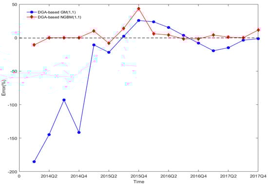 Comparison of the prediction accuracies of the two models (2014Q1–2017Q4).