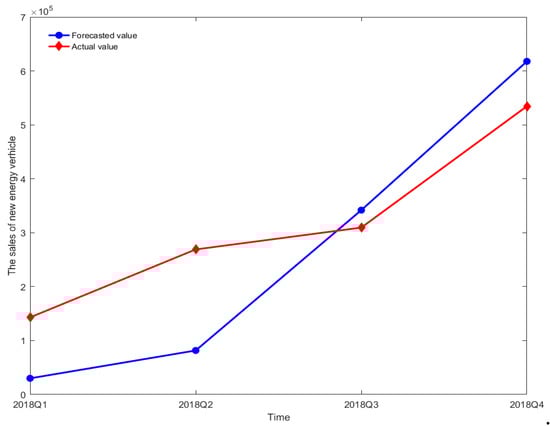 Lu et al. [] proposed the accuracy and error test of grey model in 1998. When the relative error between the actual value and the predicted value is 0–5% and 5–20%, the prediction accuracy is excellent, respectively. As shown in Table 6, the prediction error of the DGA-based NGBM (1,1) model for the third and fourth quarters of 2018 is 10.46% and 15.56%, respectively, with a high prediction accuracy, while the prediction accuracy of the first and second quarters is poor. This can be explained by the unexpected policy was released in February 2018. The Ministry of Finance and the Ministry of Industry and Information Technology jointly issued the "Notice on Adjusting and Improving the Financial Subsidy Policy for the Promotion and Application of New Energy Vehicles". The subsidy standard for 2018 is divided into three phases. The subsidy will be based on the standard of subsidy in 2017 during 1 January to 11 February, there is a transition period from 12 February to 11 June, the subsidy standard for new energy passenger cars and buses is 0.7 times that of the standard in 2017, while the new energy trucks and special vehicles is 0.4 times. The new subsidy standard will be implemented after June 12 in 2018. The sales volume of NEVs in the first and second quarters of 2018 increased by 155.68% and 93.423%, respectively, compared with 2017 because of the adjusted subsidy standard. This research uses the Pauta criterion to judge the abnormality of data [], and the results show that the data in the first and second quarters of 2018 are outliers. This is inconsistent with the assumptions of the data in this paper, which leads to poor prediction accuracy. To further verify the applicability of the DGA-based NGBM (1,1) model to quarterly data, this paper updates the dataset with quarterly data for 2014–2018 again, which including the outliers in 2018 to forecast the sales volume of NEVs from 2019–2020. The value of MAPE is 6.03%, The MAPE value of fitting result of DGA-based NGBM (1,1) model is 6.03%, which is a high-level prediction accuracy. The predicted values for 2019–2010 are shown in the table, which belongs to the high prediction accuracy, the predicted values for 2019-2010 are shown in the Table 7.