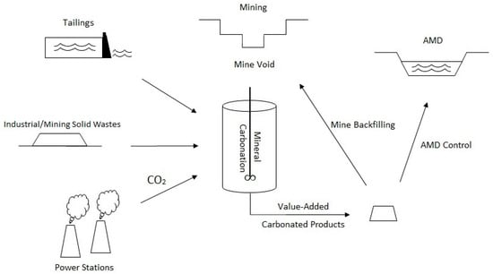 Recent investment and interest by major mining companies [22,23,24], governments (i.e., UK council for CCUS [25]), and research institutions for deploying CCUS at industrial scale, indicate the significance of these technologies. In particular, investigating the potential role of mining waste in mineral carbon sequestration, for example, investigation of mineral carbonation in diamond tailings at Venetia Mine in South Africa and the Gahcho Kué Mine in Canada [24] and process optimisation toward more economically viable technologies with reduced energy requirements [26], more efficient process routes [27,28], and recycled industrial waste feedstock for mineral carbonation [29,30] will contribute to the low carbon future. Rehabilitation of mined land often includes various factors related to the risks associated with residue during and after mining operations, for example, management of acid mine drainage (AMD). Even where high standards of remediation have been applied, there is a requirement for ongoing monitoring and management of residual risk. Nevertheless, remediation poses significant expenses to the mining industry as shown, for example, in the reports by Rio Tinto [31], BHP [32], and Glencore [33].