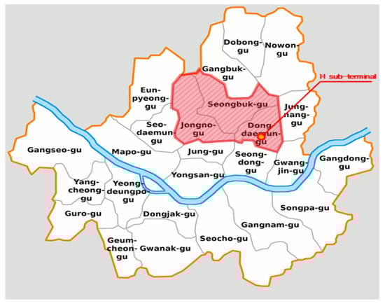 The sub-terminal operated by H delivers approximately 5250 boxes a day using 35 trucks. The couriers must deliver to all customers, including in market areas where traffic congestion and population density are significant, or in apartment complexes where trucks are not allowed to enter. In such cases, deliveries are completed using carts or trollies. The H sub-terminal in this study delivers to around 1000 locations in the districts of Seongbuk, Jongno, and Dongdaemun, which are set as A, B, and C, respectively. The three districts can be found in Figure 1. Among these locations, the average evade area rate is about 15% (10% for apartment complexes and 5% for conventional markets). The number of deliveries in the evade areas amounts to approximately 770 boxes a day, which is 15% of the total 5250 boxes delivered. This study aims to shorten the weighted distance by introducing electric cargo-bikes for the evade areas and to reduce carbon emissions by reducing the number of trucks required. Table 1 summarizes the data for the H sub-terminal.