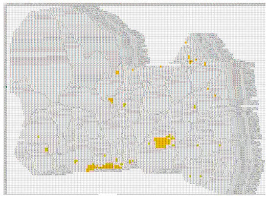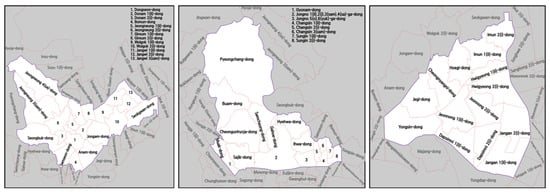 The sub-terminal delivers to three different administrative districts (gu), A, B, and C, as mentioned. The districts can further be divided into 51 smaller administrative units (dong), as shown in Figure 2. The population density of the 51 administrative units was used to probabilistically generate demand. A total of 10,255 cells were created on a spreadsheet to cover the districts, as shown in Figure 3, each cell belonging to one of the 51 units. Once the unit (dong) is chosen by population density, a cell is chosen uniformly within it.