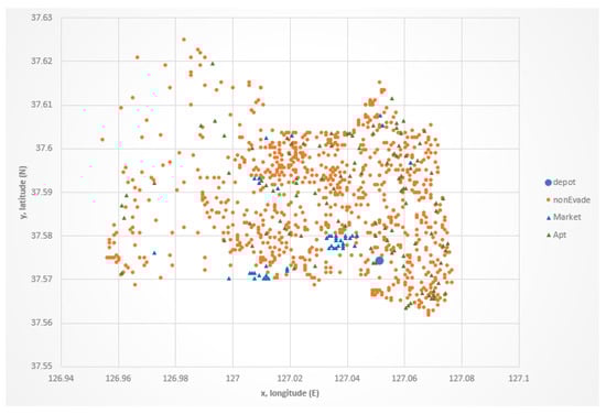The sub-terminal produces 5250 boxes to be delivered. However, to correlate with the vehicle capacity assumption, 1050 stopping locations, which is one fifth of the demand, are generated. On average, the vehicles will deliver to 1050 stopping locations, of which each location has 5 boxes to be delivered. Among the 1050 stopping locations, traditional markets and apartment complexes account for 5 and 10%, respectively, as shown in Table 1. A total of 1050 stopping locations, including 53 evade market areas, 105 evade apartment complexes, and 892 non-evade areas, were generated.