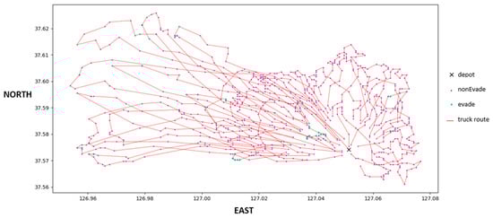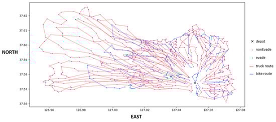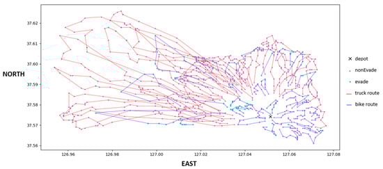 As mentioned in Section 4.1.2, trucks are replaced in two-truck intervals to determine the ratio in which costs are minimized. Please note that only an even number of trucks are replaced because 1.5 bikes are required to replace one truck, and thus, an odd replacement number would always produce redundancies. The experiment was carried out on Java with an Intel(R) Core (TM) i5-2500U CPU @ 2.20 GHz. The simulated annealing initial temperature, , and final temperature, , were set to 1000 and 0.1, respectively. The cooling rate was set to 0.95, and for each temperature, (number of truck routes + bike routes) 50,000 iterations were made to search for a solution. Demand was generated five times. For each demand and replacement number, 30 replications were made and averaged. Some solution examples are provided in Figure 5, Figure 6 and Figure 7. In the figures, the X and Y axes are the geographic coordinates of the stopping locations, e.g., 127.00 East and 37.60 North. The blue and red dots indicate evade and non-evade areas, respectively. The red lines are truck routes, and the blue lines are e-bike routes.