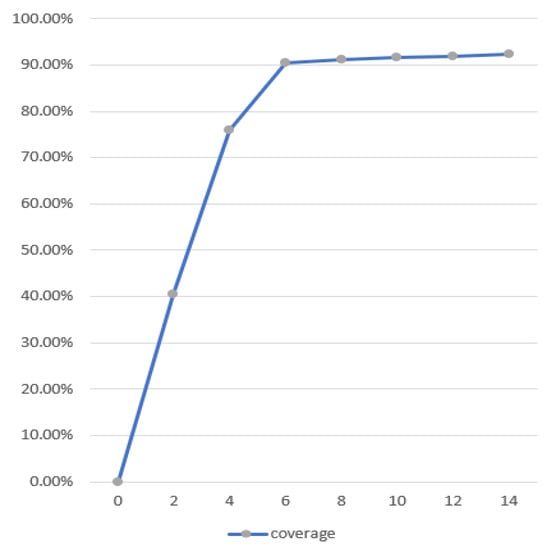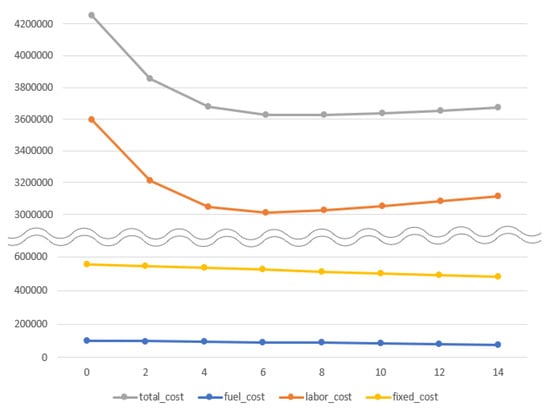 Table 5 summarizes the results. Figure 8 presents four lines indicating fixed costs, fuel costs, labor costs, and total costs. The latter is the sum of the fixed and variable costs (fuel and labor costs). We concluded that costs are minimized when six trucks are replaced with nine bikes. The benefit of replacement comes from (i) the reduced fixed costs, (ii) the reduced fuel costs, and (iii) the reduced labor costs. The most dominant among them is the reduced labor costs. As bikes take over evade areas, labor costs decrease accordingly. The Bike (%) in Table 5 and Figure 9 shows the percentage of evade areas covered by bikes. Bike coverage increases from zero to 14 replacements, but after six replacements, the increment becomes insignificant. More bike replacements after six do not really increase bike coverage. This increases travel time (labor costs), which is more significant than the decreased fuel costs.