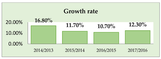 At the end of 2016, in the Global Wind Energy Council Report [23], 341.320 wind turbines were catalogued as being in operation, of which 104.934 were in China, 52.343 were in the USA, and 3589 were offshore wind turbines in Europe at the end of 2016. The evolution of the total capacity of all wind turbines installed worldwide during the period 2013–2017 is presented in Figure 1, according to preliminary World Energy Association (WWEA) statistical data [25]. Thus, in 2017, a capacity of 6145 MW was installed, with a growth rate of 12.30% compared to the previous year (Figure 2), representing a revival.