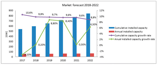 The Global Wind Energy Council (GWEC) considers, based on market statistics for February 2018, that wind energy has a major role to play in the sustainable development, “wind is the most competitively priced technology in many if not most markets, and the emergence of wind/solar hybrids, the more sophisticated grid management and the increasingly affordable storage, begin to paint a picture of what a fully commercial fossil-free power sector will look like [23].” Cumulative total installations are expected to reach 840 GW by the end of 2022 (Figure 3, [23]).