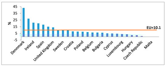 Currently, in Romania, wind energy has priority development through national strategies for sustainable development by 2030 and 2050 [30,31]. Recent Eurostat statistics for 2017 [32] highlight the efficiency of wind energy implementation in the EU Member States. Thus, at the end of 2016, EU wind turbines generated 315.00 GWh of electric energy (equivalent to more than 10% of the 3.1 million GWh produced in the EU). Denmark ranks first (43%), and is followed by other countries: Ireland (21%), Portugal (20%), Spain (18%) and the United Kingdom (14%). Romania, with a rate of about 10%, ranked tenth (Figure 4).