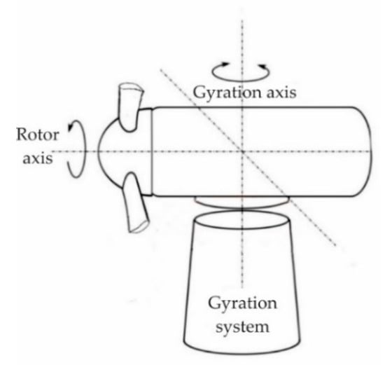 Figure 5 shows the main rotation movements of a horizontal wind turbine; the pivot system can be seen to feature a large bearing.