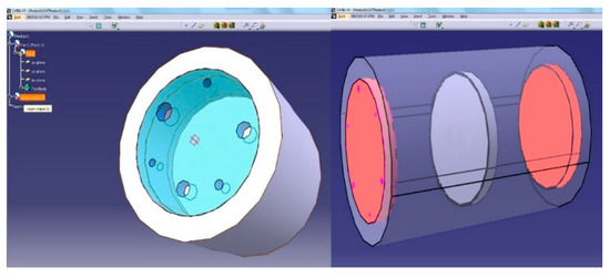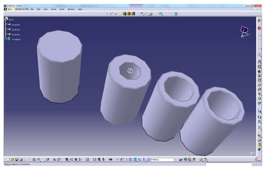 CAD/CAM software packages (Catia and Solid Works) were used to develop virtual models of hollow rollers (Figure 7). Many models have been developed based on the real situation of large solid roller bearings. The rollers’ cavities were the main element in their design. Three hollow roller 3D models with an outer diameter of 120 mm and internal diameters of 60 mm, 80 mm and 90 mm were developed.