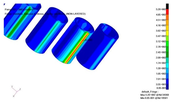 The bearing stress distribution after the application of a radial force equal to QR = 275 KN. The previously designed hollow rollers (Figure 7) are shown in Figure 10.