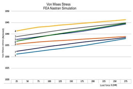 By using the Patran-Nastran software package, the Von Mises graph of stresses can be plotted by the roller type and the loading force (N/mm2); Figure 11.