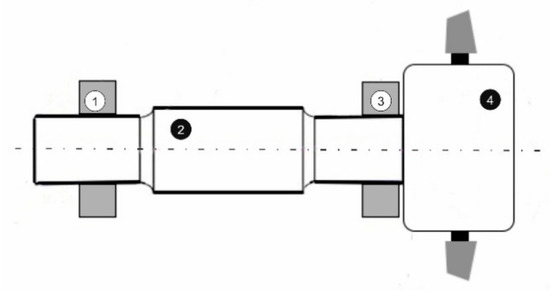 The dynamic analysis of the rotor assembly is based on the comparison between a solid roller bearing assembly and a hollow roller bearing assembly. The scheme used (Figure 12) took into account: two large bearings (pos. 1 and pos. 3), the main shaft (pos. 2) and the blade clamping system (pos. 4), which was considered to be removable in the finite element analysis. The generation of the virtual model (Figure 13) was done using Dassault Catia V5 and Solid Works.