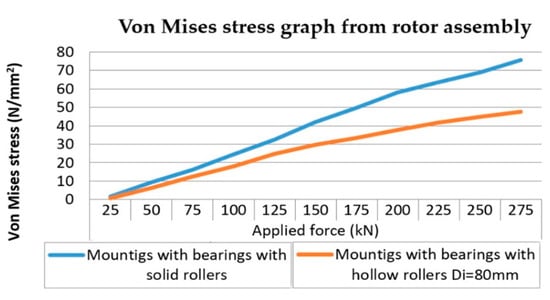 The results from the finite element analysis are shown in Figure 15. Computational elements were considered throughout the research. Variable forces (25 kN to 275 kN) were applied. The maximum pushing force Qmax = 250 kN is the pushing force of the moving blades. The reaction force in the first bearing is QReact = 275 kN, and the force in the opposite bearing is Qbearer = 150 kN. Then, the stress in the rotor assembly was measured, both for the solid roller and for the hollow roller. The Von Mises stresses on the analyzed rotor assembly are shown in Figure 15, both for solid roller bearings and for hollow roller assemblies. The results show that as the inertial masses decrease, the loading forces decrease and, with them, the effort across the system decreases. Using hollow rollers brings long-lasting benefits to all wind farms. It was observed that the maximum stress occurs in the blade section mounting area. These are the elements that set the entire assembly in motion, creating a momentum of maximum torsion. The support bearing response induces strong stresses. The decrease of inertial masses results in decreased startup resistance, forming an interesting phenomenon in the direction of decreasing stresses in the blade mounting area. In the area of the first bearing, the stress also decreases compared to the solid roller version.