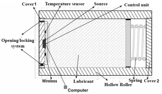 Figure 16 shows the scheme of the proposed lubrication system to be installed inside the hollow roller. Thus, the opening–closing system may be comprised of electrically actuated valves or thermal valves or magnetically actuated locking systems. The source could be a durable battery or brush collectors. The control unit could be programmable or programmed. The assembly may take place inside or outside the roller [12]. The operation of the system is managed by a control unit that unlocks the valves, leaving the lubricant to enter the runways when the sensors announce an increase in the operating temperature.