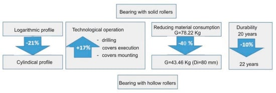 The dynamic analysis performed by using the finite element method as well as the results of the analytical calculation leads to the conclusion that hollow cylindrical rollers can replace the more expensive and heavy logarithmic profile rollers, while increasing bearing lifespan by reducing the uneven wear of the rolling elements. Uniform stress, combined with vibration reduction and operation at a lower temperature (additional lubricant can be stored in the hollow roller) leads to an increase in energy of approx. 7% for a turbine. The expected lifespan could be around 21–22 years compared to 20 years for the traditional bearings. For a 20-roller bearing, the difference is about 700 kg, 30% lighter in weight. For a product, the energy gain for 1 year is approx. 1.5% if we approximate the weight gained with the energy accumulated. The technology energy savings for a product for one year is based on cutting the consumption of tools and requires a complex calculation. It is approximately 2% and 6%, respectively. The total energy saving is approx. 26% [14].