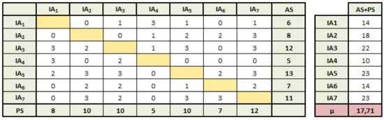 The present step focuses on assessing the network of relationships that link each single IA to the others from a quantitative perspective. This goal is achieved building an Interaction Matrix (1) related to them. The values that will populate the matrix are measured in terms of received/given flows of impacts among the studied entities, assessed via pair-wise comparisons among them. The Interaction Matrix proposed in this paper is a square matrix with matching factors listed in the same order for both rows and columns. Given any IA, the meaning of every “aij” position within the square matrix (“m x n”, where “m = n”) is the following: how much the IA corresponding to the “ith” position impacts (i.e.,: influences) on the IA corresponding to the “jth” position. Values on the diagonal are computationally considered null [62], even if—since we are speaking about intangible entities based on knowledge—some autopoiesis-like phenomenon could be theoretically possible (and quite desirable indeed) thus generating a self-loop, as illustrated by qualified literature [63].