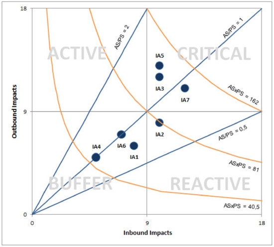 Furthermore, the utilization of such a type of quantitative methodology enables the evaluation to benefit from some analytics and diagnostic indicators about the interconnections between the studied entities. The purpose of this further level of inquiry is profiling them into homogeneous groups. Using the Active and the Passive Sum totals as coordinates, the position of the set of IAs can be plotted in a Cartesian chart (Connectedness Matrix, on Figure 1). In relation to the score achieved on these two dimensions, the IAs are positioned on the graph and the plot-area can be divided into four homogeneous groups: