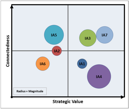 Considering the three points above illustrated, it is possible to plot the rank of every IA on a shared chart (Figure 2). In order to display its status from a graphic standpoint, the three dimensions of analysis are associated with Cartesian coordinates as follows. Values are taken directly from the Scorecard newly populated with normalized numerals. On the vertical axis: “Connectedness”. On the horizontal axis: “Strategic Value”. The combination of these two dimensions builds the Resource Prioritization Matrix. The third dimension, “Magnitude”, is quantitatively symbolized by the radius of the element representing each IA.