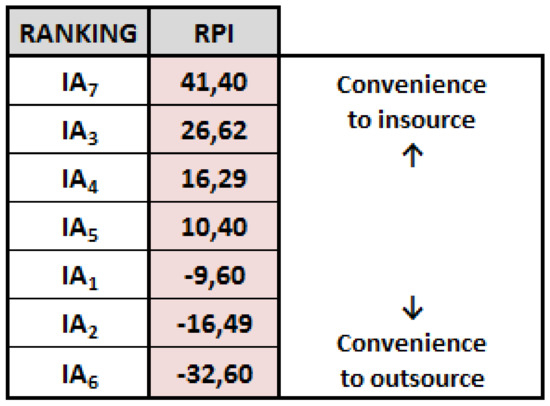 At last, after reiterating the application of (14) to every IA of the set, using the resulting numbers it is possible to order the IAs and build a ranking in order to prioritize the intangible resources (example provided in Section 5): the lower the RPI is, the most convenient is to outsource that intangible resource, and vice-versa.