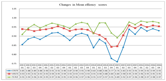 Trends in mean efficiency scores. Note: CRSTE: constant returns to scale technical efficiency; VRSTE: variable returns to scale technical efficiency; SCALE: scale efficiency.