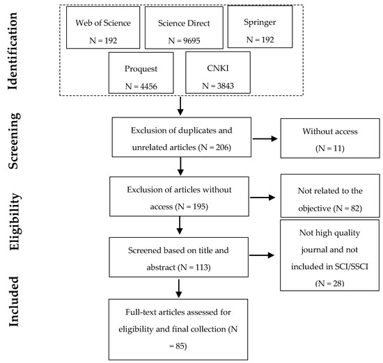In order to collect as comprehensive related literature as possible, the Web of Science Core Collection of Thomson Reuters, Science Direct, Springer, Proquest, and China National Knowledge Infrastructure (CNKI) databases domestically and abroad were employed in this paper. Related papers in both English and Chinese were included in the consideration of difference research trends between China and the rest of the world in order to fulfill the intention of drawing a complete portrait of the research nowadays. Commonly used as a source of bibliometric data, the Web of Science Core Collection has had comprehensive coverage of over 3000 journals across 55 disciplines since 1956, and ensures the quality of the literature by using the commonly accepted citation indexing. Science Direct hosts over 12 million pieces of content from 3500 academic journals, and is especially famous for its section of Social Sciences and Humanities. The section “Business, management, and accounting” covers over 100 periodicals and lists potentially important new journals that are not yet included in the citation indexes. Besides, both Springer and Proquest are world-famous database, including plenty of research papers covering many disciplines. The China National Knowledge Infrastructure (CNKI) is the largest database in China for education, publication, and academia, containing almost all the disciplines and research. These five databases cover most of the studies in this field.