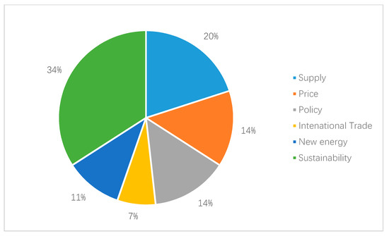 As shown in Figure 4, the main research fields on the economics of REs include research on the supply, price, international trade, policy, relationship with new energy, and sustainability. Among the fields, it is not surprising that sustainability accounts for the largest portion due to the exhaustible situation and irreplaceable position in the modern economy. Moreover, it is worth noting that recently, the number of analyses of REs in the field of renewable energy has increased, which has been a rarely explored field. This may be the result of the shift from the traditional economy to a low-carbon economy, the pressure of environmental issues, and the need for greater energy security. At the same time, concerns about the supply crisis of REs and the policy changes of the Chinese government have drawn the attention of researchers in the fields of policy and supply. In addition, the prices of REs are a key factor that determine the strategies between importing REs from China or investing in exploring other REs resource implemented by the countries outside China. Furthermore, it is also important for many corporations to decide whether it’s profitable to expand production. The field of price is also an interesting field that has a direct influence on international trade.