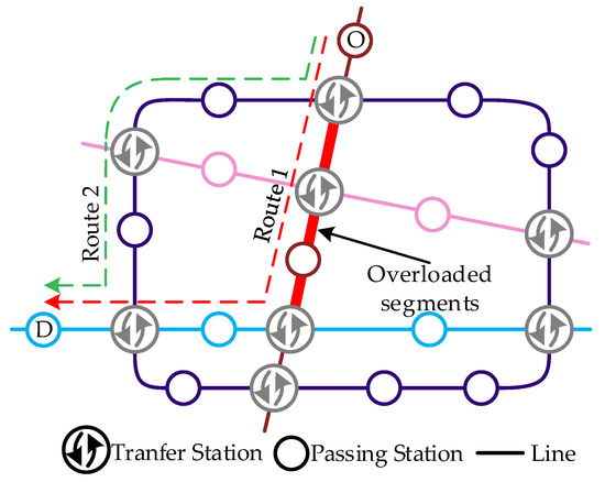 The travel demands of passengers often have a specific requirement on the use of certain routes particularly during peak hours. However, restricted by the ability of the infrastructure, equipment and right-of-way, train capacity cannot adequately match the peak hour excessive travel demands along those routes or segments because increasing the capacity is simply not always a feasible solution. Fortunately, with the development of the metro system, the network accessibility has been greatly enhanced. Passengers may have several routes to select from for each OD pair so as to complete their trips. As such, this paper intends to alleviate the peak hour congestion from the demand side using a service-oriented load balancing approach. By optimizing the passenger flow distribution in the metro network, the oversaturated situations may be gradually reduced. For example, Figure 2 shows a simple metro network. Route 1 is the shortest route in travel time from station O to D, which will be chosen by most passengers travelling in the peak hours. However, with the heavy passenger loads on it, Route 1 may be extremely crowded on some segments (which are shown as overloaded segments in Figure 2), and therefore at some stations, passengers may find it extremely hard to board the first train. The overcrowding will have an enormous impact on passengers under such scenarios. Some studies have been investigated that crowding affects the route choice of metro passengers and people will reroute or even have a willingness to pay (WTP) to avoid the in-vehicle crowding [1,14,15]. All the studies that have been reviewed indicate that crowding will increase the value of generalized travel time. Based on this inner motivation of passengers, to mitigate the severe congestion on overloaded segments of Route 1, an alternative Route 2 with surplus capacity can be effectively leveraged to share the large passenger loads on Route 1.