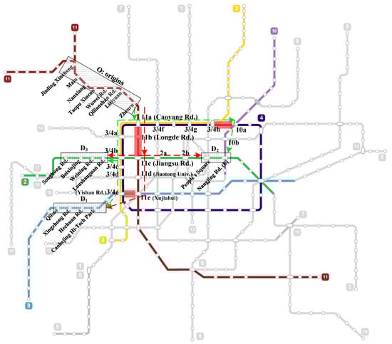 On 3 March 2016, during the morning peak period of 08:30–09:00, the mean occupancies of trains along segments Caoyang Rd.–Longde Rd.–Jiangsu Rd. (in the direction from Caoyang Rd. to Jiangsu Rd.) and Xujiahui–Yishan Rd. (from Xujiahui to Yishan Rd.) are 95.63%, 94.92%, and 97.64% respectively. Such occupancies far exceed the threshold of 85%. Hence, Caoyang Rd.–Longde Rd.–Jiangsu Rd., and Xujiahui–Yishan Rd. can be declared as overloaded segments. In Figure 6, all of the involved lines are colored, and all of the related stations are presented by numbers and letters (e.g., 11a). The overloaded segments 11a–11b–11c on Line 11 and 11e–3/4e on Line 9 are marked in red shadow boxes. The OD pairs and ridership causing the congestion on overloaded segments 11a–11b–11c in peak period of 08:30–9:00 have been acquired [22]. Among them, three clusters of OD pairs (OD1, OD2, OD3) and 41.07% of total ridership, have effective alternative routes and are shown in Figure 6, where red dotted lines represent the routes with overloaded segments and green dotted lines denote under-utilized alternative routes. The OD pairs, ridership and the set of effective alternative routes for testing the performance of load balancing method are provided in Table 3. Note that, the effective alternative route had an overloaded segment Baoshan Rd. (3/4h)–Hailun Rd. (10a) with an occupancy of 97.37%, so and are the preferential effective alternative routes used in the loading process.