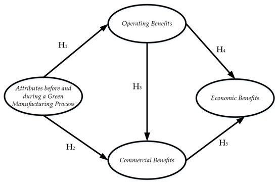 Similarly, companies need to obtain greater income with the minimal environmental impact as well as use raw materials that have a minimally negative effect on the environment and society—but the product must still be economically viable [61]. Thus, the search for Economic Benefits will not be only focused on manufacturing operations, but also on the marketing and distribution of the product, as a strategy to encourage the consumption of green products among customers [62]. Likewise, by achieving greater Commercial Benefits with the increase in the number of products classified as green and environmentally friendly [33], Economic Benefits are generated and measured by the increase in sales and economic profits. In that case, the development of processes, products, and green distribution will be a competitive advantage and a way to maximize Commercial Benefits and Economic Benefits with GM [60]. Therefore, the following hypothesis is proposed: