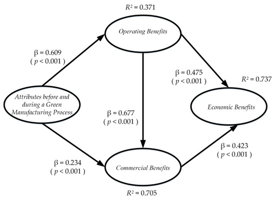 This paper reports a second-order structural equation model composed of four variables: the green attributes before and after an industrial production process, the operating benefits, the commercial benefits, and the economic benefits. The variables are related by means of five hypotheses and are validated statistically with information obtained from 559 responses to a questionnaire applied to the Mexican maquila industry. The model is evaluated using the technique of partial least squares and the results obtained indicate that the green attributes before and after the production process have a direct and positive effect on the obtained benefits, mostly on the operational ones. It is concluded that companies that are focused on increasing their greenness level must monitor and evaluate the existence of green attributes in their production process to guarantee benefits and make fast decisions if required due to deviations.
