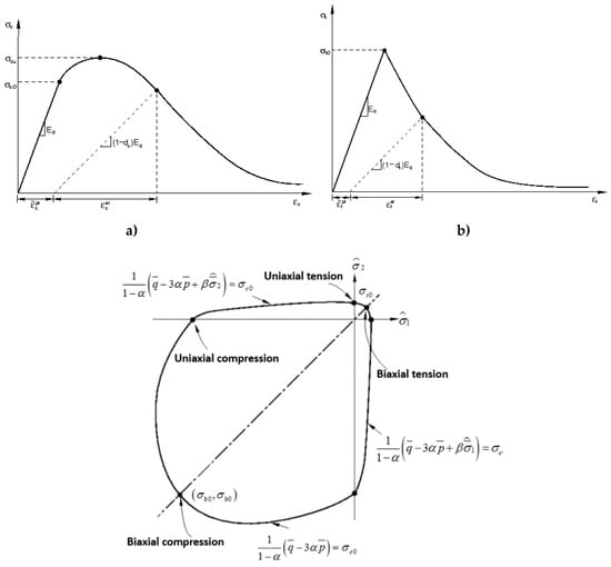 - Lubliner, J.; Oliver, J.; Oller, S.; Oñate, E. A plastic-damage model for concrete. Int. J. Solids Struct. 1989, 25, 299–326. [Google Scholar] [CrossRef]