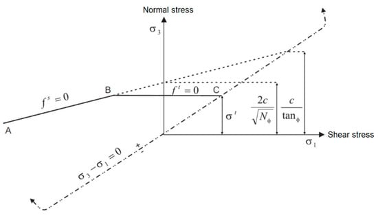 Note that the tensile strength of the material cannot exceed the value of σ3 corresponding to the intersection point of the straight lines fs = 0 and σ1 = σ3 in the (σ1, σ3) plane. This maximum value is given by . The potential function, gs, used to define shear plastic flow, corresponds to a non-associated law according to the equation gs = σ1 − σ3Nψ, where ψ is the dilation angle and .