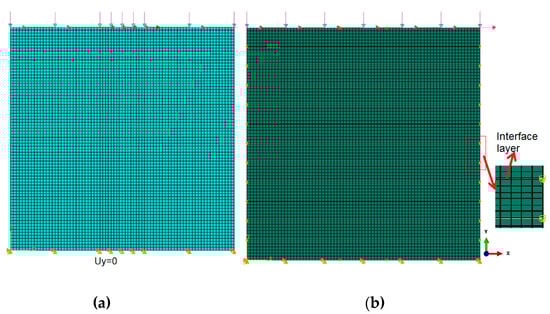 For the full-scale wall with dimensions of 3.0-m-length × 3.0-m-height × 0.5-m-thickness, twenty-four intralayers with 120-mm-thickness were assembled and linked by the interlayers of 5-mm-thickness. The wall was modeled using the 4-node bilinear plane strain quadrilateral elements (CPE4R). The mesh was discretized with a fine mesh measuring 20 mm, except in the height direction of interlayers where a fine mesh of 5 mm was applied (Figure 10). The wall was simply supported at the base.