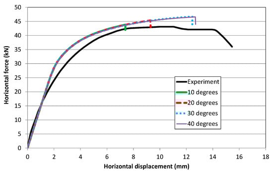 For intralayers, the experimental compressive strength was used (fc = 2 MPa). The Young’s modulus, density and Poisson’s ratio were taken following experimental results presented in previous studies, which were of 400 MPa, 2300 kg/m3 and 0.22, respectively [,]. The tensile strength ft was taken equal to 0.13 MPa [] with the fracture energy of 0.012 Nmm/mm2 []. The effects of the dilation angle on the behavior of the model was studied. For simplification, the dilation angle was only studied for the case without interlayers. Figure 5 shows the influence of different values of dilation angle on the load-deflection response. The FEM obtains a similar rigidity and the ultimate load in comparison to the experimental one. However, the onset of cracks in the FEM model (Fcrack_FEM = 310 kN) appeared later than the one of the experimental curves (Fcrack_experiment = 210 kN). The results show that the dilation angle does not influence the first parts of the response, it only influences the ultimate displacements changed. A dilation angle of 30° could provide an acceptable agreement between the numerical and experimental results.
