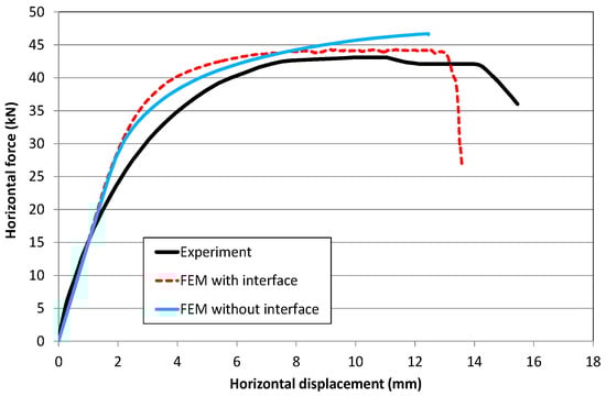 The results of a horizontal loading test presented in El-Nabouch [] were used to validate the FEM model used in the present study. A RE wall of 1.5-m-length × 1.5-m-height × 0.25-m-thickness constituting of 12 intralayers were tested in that study (wall 3 in reference []). The vertical loads were firstly applied to the top of the wall to simulate the dead and live loads in a building. These vertical loads were maintained at a constant weight, then a horizontal force was applied on the top of the wall, with a displacement rate of 1 mm/min, until the failure. The results obtained from this experimental test will be presented in the next section for the comparison with the numerical simulation.
