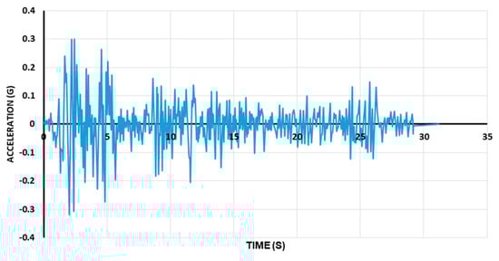 The present study applies the time history analysis method, which is a nonlinear dynamic approach with time integration. The structure is subjected to a seismic ground motion. This method is a complex process which consumes time and needs extensive computing capacities; however, this method is assumed to be more accurate than the equivalent static methods because the dynamic effects can be taken into account. In the present study, the NS component of the El Centro 1940 earthquake (Figure 9) was chosen which corresponded to a strong motion (PGA = 0.319 g where g = 9.81 m/s2). The maximum acceleration amax = 0.319 g reaches at t = 2.02 s. This earthquake signal is a famous one and is often used in scientific research.