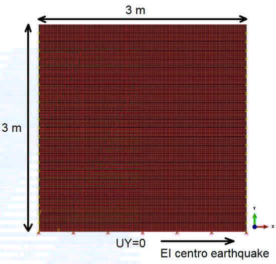 The numerical investigations were conducted with the finite element method (FEM) by the Abaqus software [], which has been widely used for the structures with conventional materials such as steel, concrete and masonry. Several studies in the literature have used FEM to simulate the mechanical behavior of RE walls (for example references [,,,,]), however, to our knowledge, no study using FEM and applying the time history analysis has been presented. Besides the FEM used in this study, the discrete element method (DEM) which had largely been developed to model masonry walls [] was also a relevant approach to model RE walls [,,].