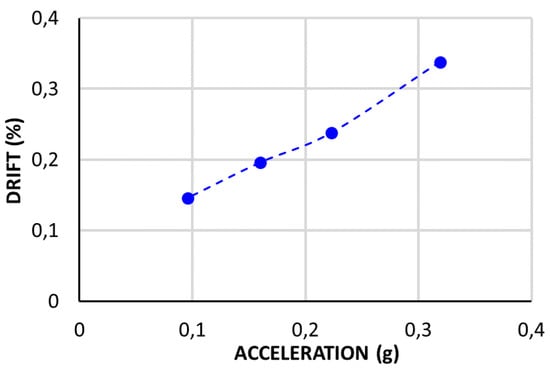 In order to assess the seismic performance of the studied wall, the IDA (incremental dynamic analysis) method [] was applied: the real signal was scaled at different amplitudes, respectively 70%, 50% and 30% amplitudes of the real signal, which corresponded to the maximum accelerations amax of 0.223g, 0.160g and 0.096g, respectively. The maximum drifts and the damage modes are illustrated in Figure 12 and Table 4.