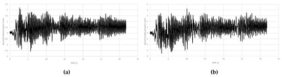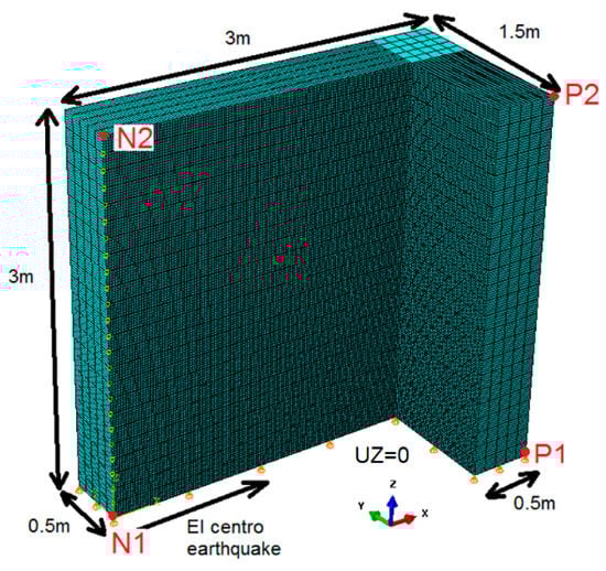 The wall was modeled by using eight-node volume elements (C3D8I). The mesh was discretized with a fine mesh measuring approximately 20 mm, which reached mesh convergence, except for the height direction of interlayers where a fine mesh of 5 mm was applied (Figure 13). In the out-of-plane direction of the transversal wall added (0.5-m-thickness, called “transversal flange”), the wall was meshed into five layers. The boundary conditions of the wall were the simple supports at the base. The origin of the system is at the point N1 (0,0,0). The coordinates of the center of mass and the rotation center at the point of connection with the supports are (1.81 m, 0.0625 m, 2.39 m) and (1.81 m, 0.0625 m, 0 m), respectively. The vertical loading applied on the top of a RE wall was of 0.1 MPa, similar to the previous case. The equivalent mass (15 tons) was also added at the top of the wall. The dynamic loading was introduced at the base of the wall. The natural frequencies obtained for four first vibrational mode from numerical simulation were 9.14Hz, 12.65Hz, 15.65Hz and 20.40Hz. The dynamic excitation was introduced to the model with rate of each 0.013 s (Δt). It is usually assumed that the rate is acceptable when Δt < T/8 where T is the period of the highest mode of interest, which is about 10–20 Hz for RE structures []. Three different signals were introduced which corresponded to 100%, 70% and 30% the amplitude of the real signal, which were equivalent to the maximum accelerations of 0.319 g, 0.223 g and 0.096 g, respectively.