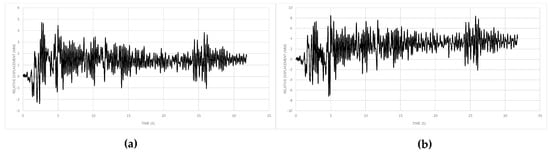 Variation of the relative displacements in function of time, for the case of 30% real excitation: (a) points N: in-plane of the longitudinal wall; (b) points P: out-of-plane of the transversal wall.