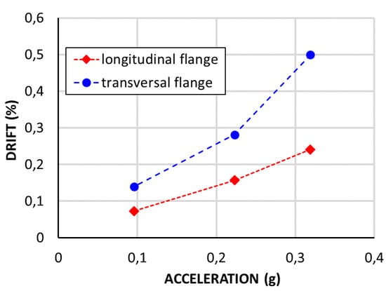 The relative displacements and the drifts obtained are presented in Figure 14, Figure 15, Figure 16 and Figure 17. For all loading cases (amax = 0.319 g, 0.223 g and 0.096 g), the maximum drifts of the longitudinal flange were lower than that of the transversal flange (Figure 17). This result is comprehensible because the seismic signal was introduced in the direction parallel to the longitudinal flange, so this flange had an in-plane behavior, while the transversal flange had an out-of-plane response.