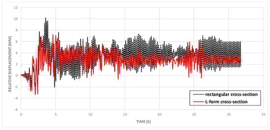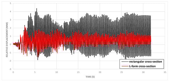 Figure 18 and Figure 19 illustrate the variation of the relative displacements in function of time, obtained for the in-plane longitudinal wall in two cases: walls having rectangular and L-form cross-sections. It is observed that the L-form cross section wall had lower relative displacements when compared to the rectangular cross-section wall. This remark suggests that the presence of the transversal flange decreased contributed positively to the seismic performance of RE wall by decreasing its relative displacements under dynamic loadings. This result may come from the non-neglected thickness of RE wall being investigated (50-cm).