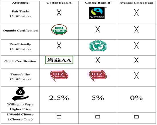 As previously mentioned, existing research on certified coffee has focused on fair-trade labels, for example, Hainmueller et al. [30], explore consumer demand for fair-trade labels in detail. Koppel and Schulze [31] explore the determinants of consumers’ WTP for fair-trade products, yet few studies assess consumers’ trade-offs between fair trade and sustainability and organic certification [28,32], or fair-trade and shade-grown coffee. Therefore, in addition to distinguishing the attributes of each coffee certification, i.e., fair-trade, organic, environmentally friendly, and traceability, this study incorporates the coffee grading system and adds in a consumer’s WTP for coffee certification.