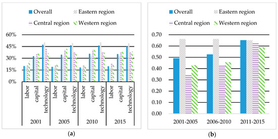 (a) Proportion of output value of different factor-intensive industries among China’s manufacturing industry during the period of 2001–2015. (b) Average value of manufacturing innovative efficiency among different regions of China during the period of 2001–2015. Note: Calculated according to China Industrial Statistical Yearbook.