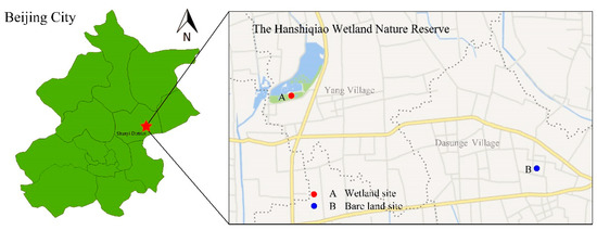 The Beijing Hanshiqiao Wetland Nature Reserve (40°07′ N,116°48′ E) covers a 1900 hm2 area, as shown in Figure 1. The core zone, buffer area, and experimental zone take up 8.61%, 0.63%, and 90.76% of wetland natural reserve, with the area of 163.5 hm2, 12.1 hm2, and 1724.4 hm2, respectively. The dominant species mainly included Phragmites australis, Echinochloa crus-galli, and Nymphaea tetragona. The average temperature of this site was 11.9 °C, and the annual average precipitation was 603.1 mm. The control site was bare land in Dasunge Village, about 10.5 km away from the Beijing Hanshiqiao Wetland Nature Reserve. The bare land includes a 70% cement pavement surface and 30% soil surface, and is 50 m in length and 20 m in width.