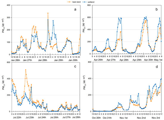 Variation in the average concentration of PM2.5 on the wetland and bare land during different seasons. (a–d) is winter, spring, summer, and autumn.