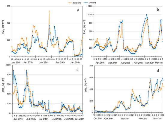 Variation in the average concentration of PM10 on the wetland and bare land during different seasons. (a–d) is winter, spring, summer, and autumn.
