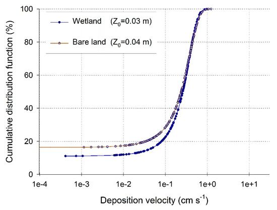 Deposition velocity of PM10 and PM2.5 on the wetland (Z0 = 0.03 m, V = 0.28 m/s) and bare land (Z0 = 0.04 m, V = 0.25 m/s) using its cumulative distribution function.